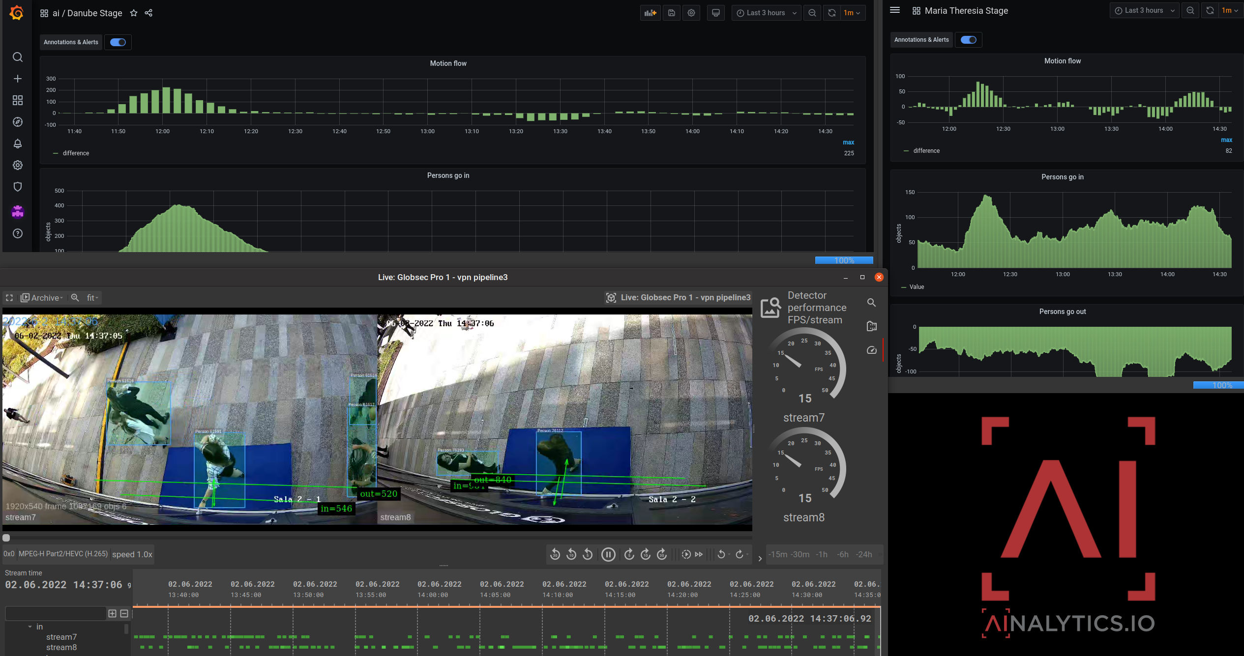 Subsystem for object detection, tracking and classification. It can work in parallel with a number of real-time inputs (RTSP) and the output is also RTSP stream marked with detections and meta data. Detection models can be updated automatically remotely for better accuracy or for adding new types of detected objects.